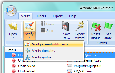 Domain checking is performed by connecting to DNS servers and querying domain names of e-mail addresses (e.g. checking domain.com for existence of kate@domain.com email address). Checked domains are marked in domains list in the following way: