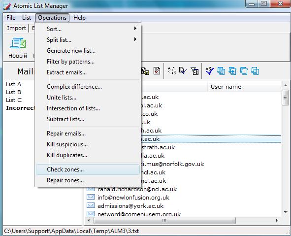 This function verifies correspondence of the 1st domain and zone in the selected list. In case such correspondence is not found in the list domains.txt (file is in the Program Files\Atomic List Manager\ ), email is stored in “incorrect list”. Note! Search is key sensitive.