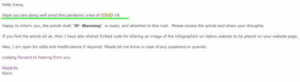 Let’s also have a look at cold outreach in this time: Cold outreach covid email As the expression of reflection, the sender shows worrying about the recipient’s condition. The rest content hasn’t any words about coronavirus. As we see, the mass mailing is actual at all times and crisis is not an exception. COVID-19 requires marketers to be more flexible. Now as never before it is important to show love and care and sending emails connecting coronavirus is the best way to express it.