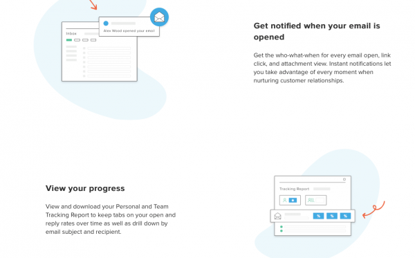 Yesware features amazing functionality, providing users with the complete spectrum of email tracking options. With this app, you can track who, when, and how many times opened your email. This program also enables real-time notifications for the emails you track and allows you to see the history of tracked emails through its Activity Feed feature. You can filter your emails by categories such as “Not Opened,” “Recent Activity,” and, lastly, “Opened but not replied.”