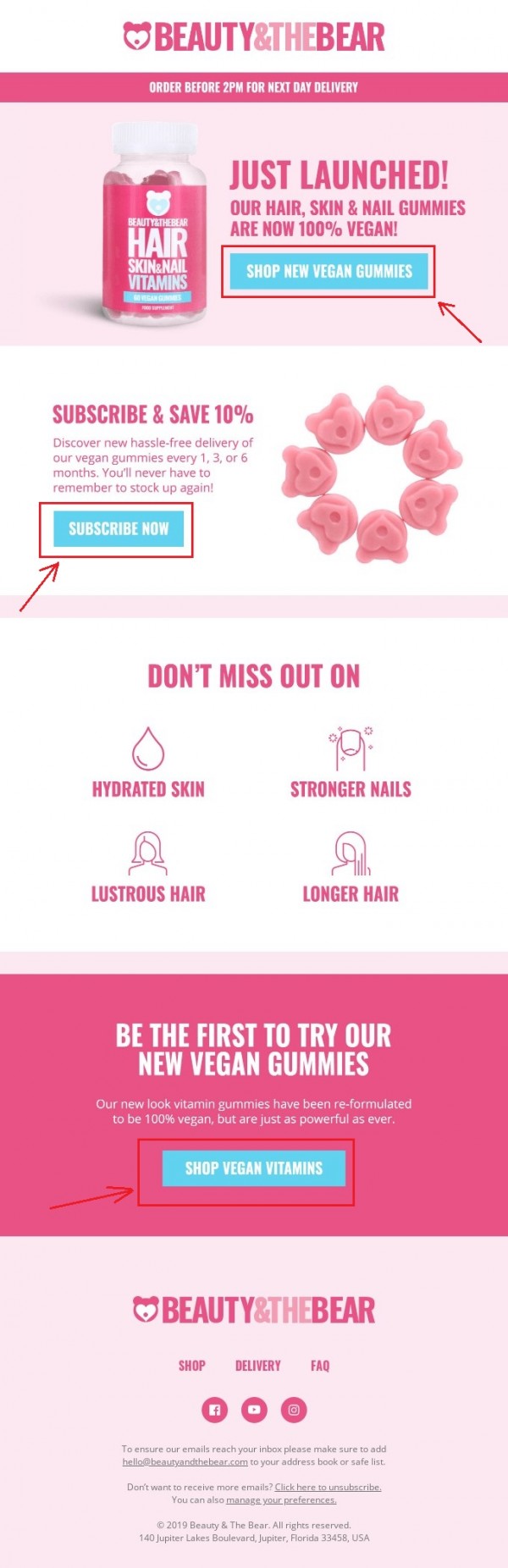 The email by the cosmetics seller Beauty&TheBear is not really good as there are a few different calls to action. So, the users will be embarrassed by their number and will not know what to do: either to shop new products or to subscribe to news. And as a result, they won’t do any of these actions.