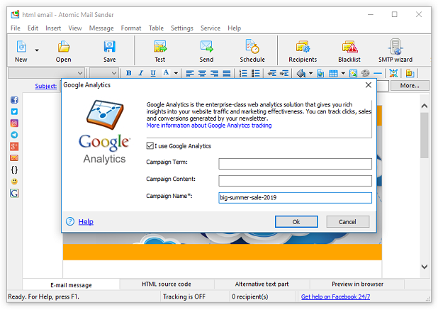 Also, it's highly recommended to include a UTM markup to your email links which will further help you analyze the progress of your campaign and track it on the chosen system (Google Analytics or similar). The system offers GA integration too: