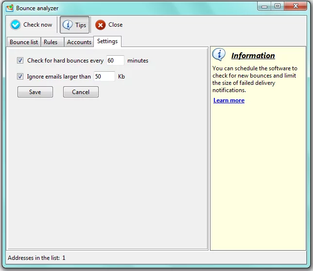 Check for hard bounces every ____ minutes – set a time period within which the program will check your mailbox and incoming e-mails for bounce-related error messages. This is a good way to automate the process of identifying and removing non-existent addresses.