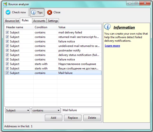 For instance, if you create a bounce rule with header name=subject, condition=contains, value=mail failure, Bounce Analyzer will check and extract every invalid e-mail address from messages where the subject contains the words – “mail failure”.
