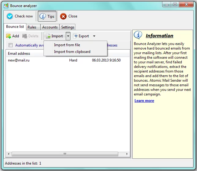 You can import the list of bounced email addresses from a .txt file or the clipboard into the Bounce Analyzer.