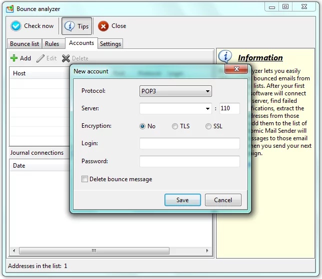 Before starting to work with Bounce Analyzer, you need to create a new account. To do this, enter the main settings for the e-mail account so the program can access it and check the inbox folder to see if there are any error messages.