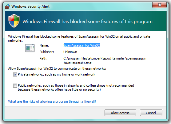 Click “Allow access” to allow access for Spam Assassin to the Internet.
