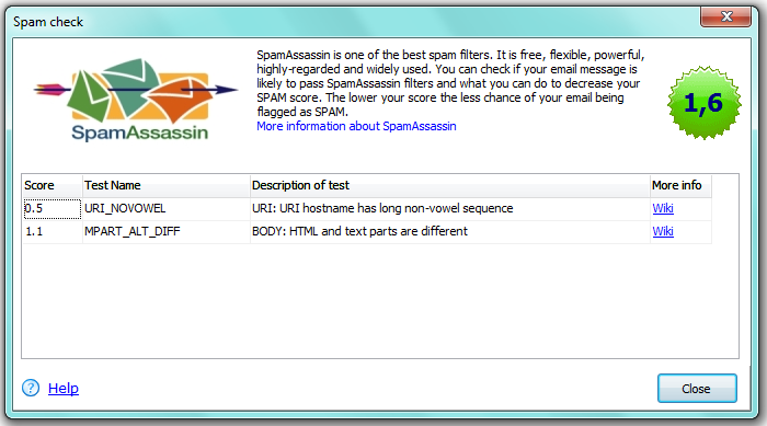 “Score” — the filter uses points for rating the message. The filter’s pass-through function depends on it’s settings, that can differ with recipients. It can be set for the point 2 for passing messages and all the messages with higher point will be marked as spam. The lower your score is the less chance of your e-mail being marked as spam. Every “mistake” rates separately.