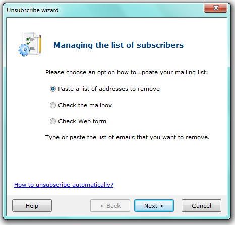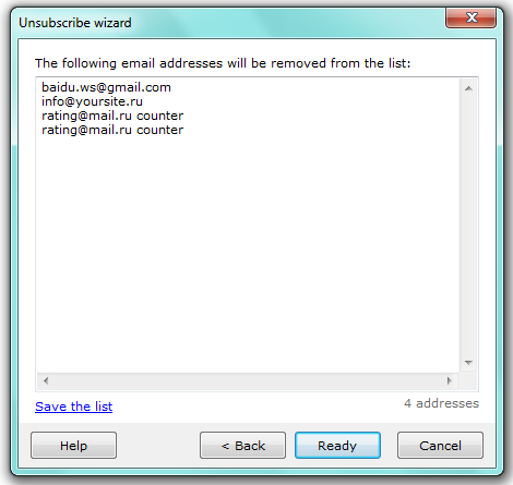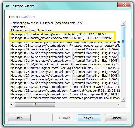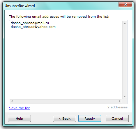 Check the mailbox — the program will update the mailing list automatically after checking “REMOVE/UNSUBSCRIBE messages”. All the addresses these messages were sent from are deleted from the recipient list.