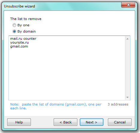 By domain — specify domain names to be deleted from entire list. The Atomic Mail Sender will exclude email addresses with specified domain name from the currently loaded mailing list.