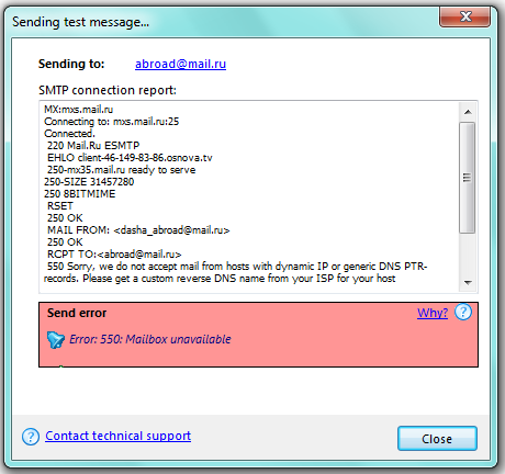 After you have entered the address press “Send”. The “SMTP connection report” will be opened.