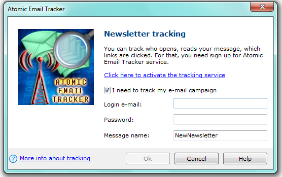 Atomic Email Tracker is an on-line service. You sign up for the tracking service on our site and activate the account, then you simply enter the account login in Atomic Mail Sender and it will start collecting the stats. When you send out your mail, Atomic Mail Sender makes appropriate corrections in the original code to allow stats collection.