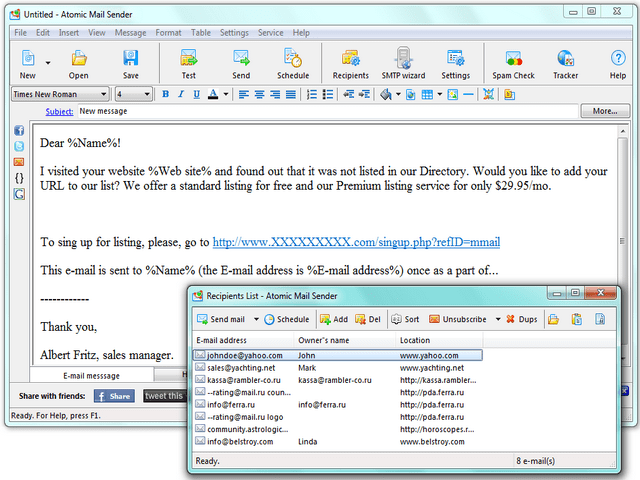 When you send personalized mail, your recipients will receive messages with their real names and website URLs inside. This will improve response rates compared to non-personalized messages.