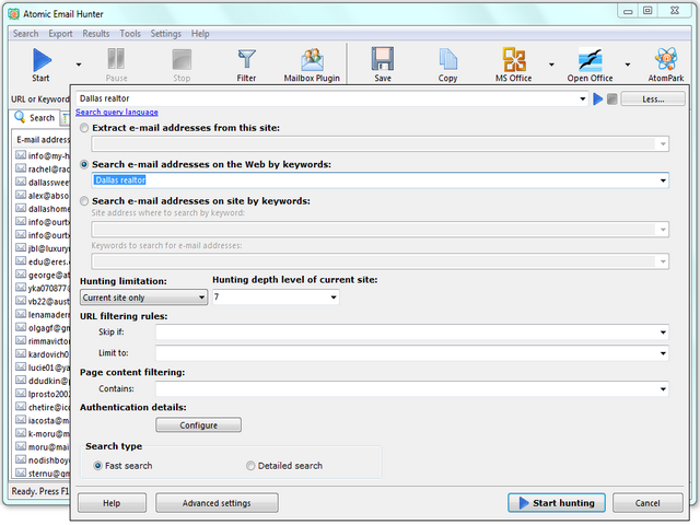 You are able to make a search on the specified site (by URL) or the entire web by keywords or on the defined site by keywords. When using keywords, the program goes to search engine you selected and automatically finds the most relevant sites to search. The list of sites is retrieved and the program starts to process the sites and automatically get the addresses. On searching on the website by a keyword Atomic Email Hunter filters the site content according to the search query and extracts email addresses from the selected information. Such search makes the mailing list with the most relevant target audience!