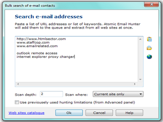 Enter or paste a list of the links and / or keywords in a dialog window. Atomic Email Hunter will extract email addresses from all listed pages. Also you may specify some limits (such as in the “Advanced search options” panel)