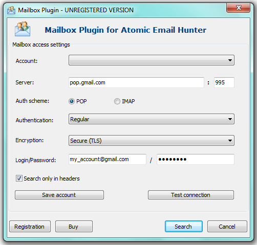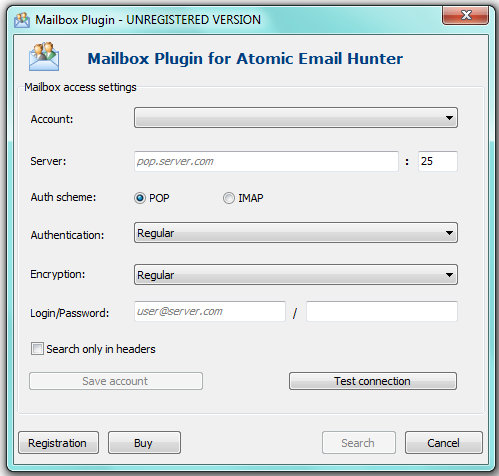 New version of Atomic Email Hunter 9.xx supports plugin technology and contains a built-in Mailbox Plugin. Its aim is email address extraction from your mail account. When using Mailbox Plugin for Atomic Email Hunter, the program connects to your mail server, scans email messages you have received and extracts all available email addresses, even from the email body. You can limit the hunting options and scan headers of email messages only, so you will get the addresses of people who have ever sent you an email, your correspondents.