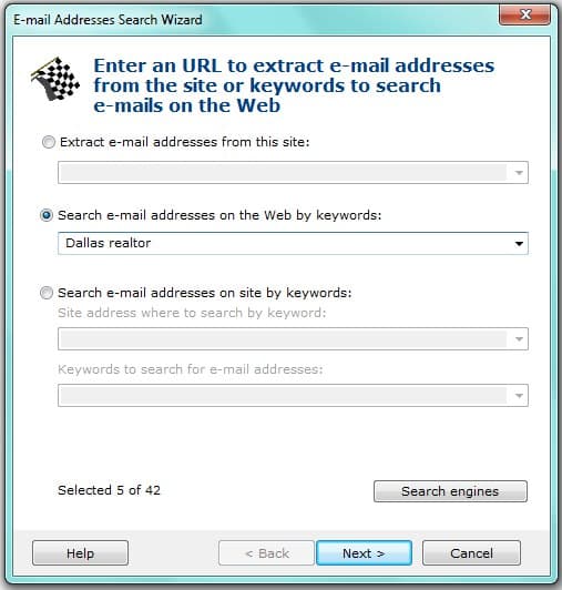 First step: choose the way of harvesting email adresses from the web: by extracting emails from the given site or by searching email addresses on the web by keywords (Atomic Email Hunter will automatically find the best sites for exploring), or extract email addresses from the keyword-filtered information on the specified website.