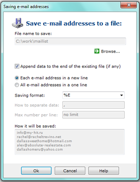 Click on the “Save” button on the toolbar for saving email addresses to a file or on the “Copy” button to copy the information to Clipboard. Enter a file name to store the extraction results and check in “Append data to the end of the exciting file” option for saving your previuos information in the file. If you are exporting to Clipboard then skip it.