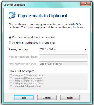 “All email addresses in one line” – if this option is checked all addresses will stored in one line. It is the best option if you are going to paste this list into the Outlook or another email client into To, CC or Bcc field.