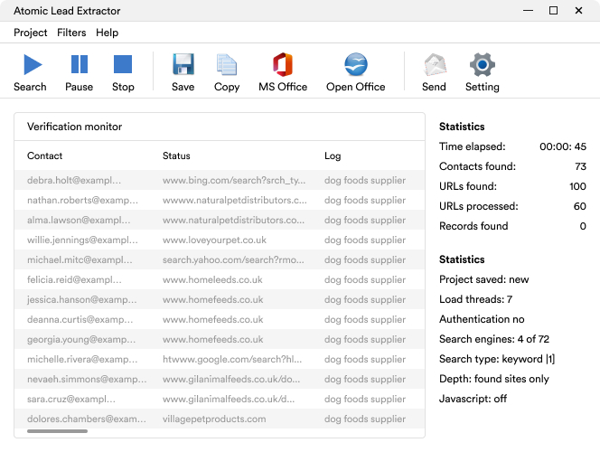 This lead search type is similar to the previous option, but Atomic Lead Extractor will use your preferred search engine to find pages shown in the search results.