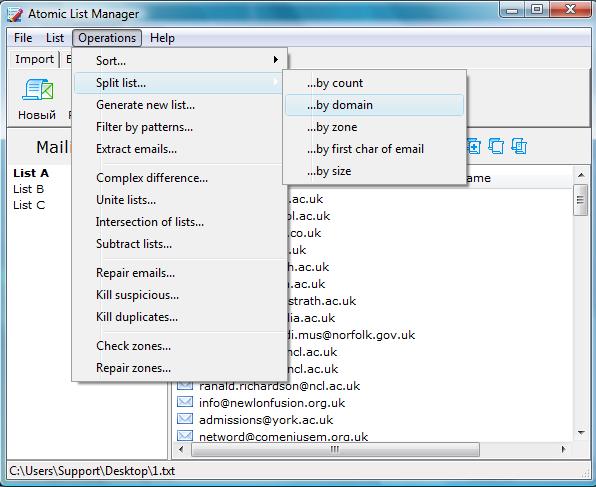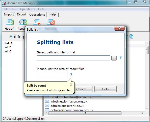For example, as a result of spliting by count of a list of 11 emails into lists of 4 emails we will get 3 files saved automatically. Two files will contain 4 emails each and third file will contain 3 emails.