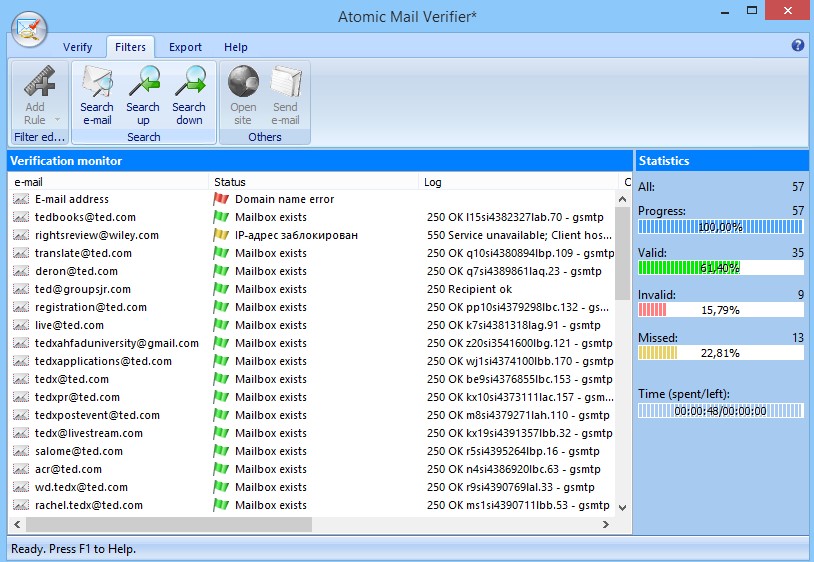 Buy for $69.85Atomic Mail Verifier is a unique program that checks email addresses for validity. Unlike other email verification software, our email verifier uses three levels of verification to ensure that you will never lose any valid email address. If you need to verify email address is valid, a bulk emailing service from Atomic Software will be a reliable solution for your email work out with trusted user reviews. The most accurate verification tools that are available for easy download and usage for the best price on the market may help to increase the chances for your email campaign success and boost confidence in your next email strategy. When you apply Email Verifier, you make sure your mailing list contains only real addressees with actual contacts which are your potential leads.